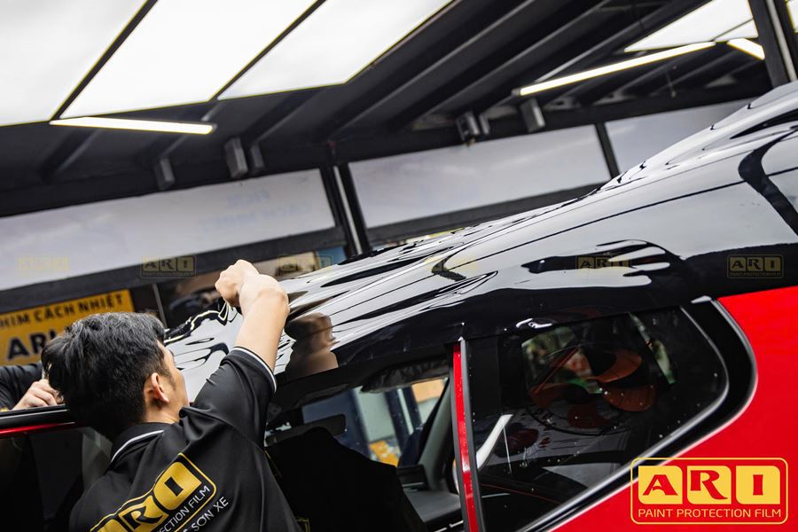 ✅ Bước 3: Thi công dán nóc đen chuyên nghiệp: Sử dụng kỹ thuật dán ướt để loại bỏ bọt khí, giúp lớp phim bám đều và không bị gợn sóng.