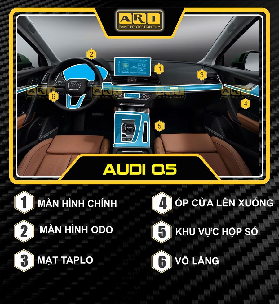 CAO SANG AUTO sử dụng phim PPF ARI chính hãng trong dịch vụ dán PPF nội thất Audi Q5, đảm bảo hiệu quả bảo vệ lâu dài và tính an toàn cho bề mặt nội thất.